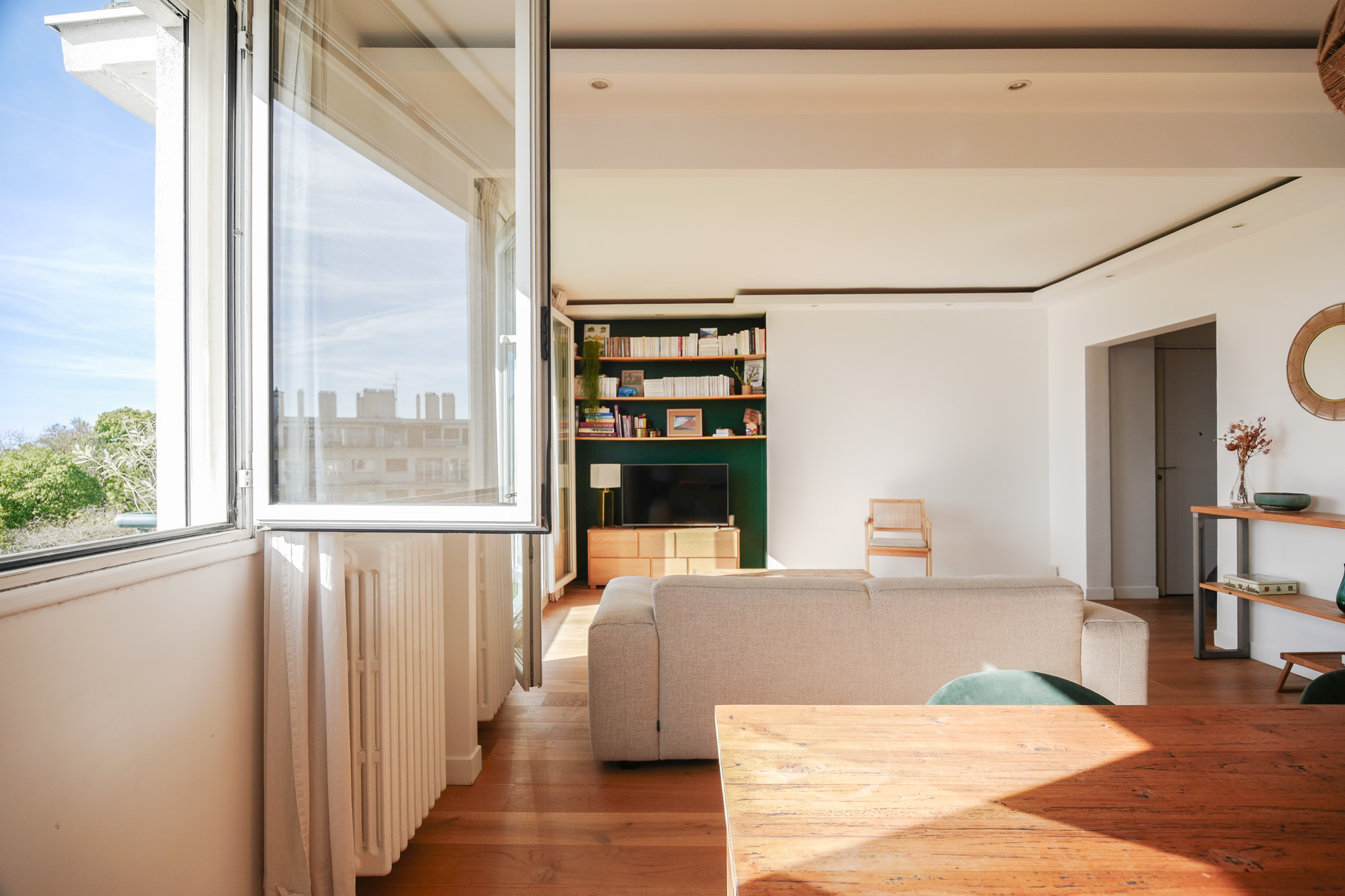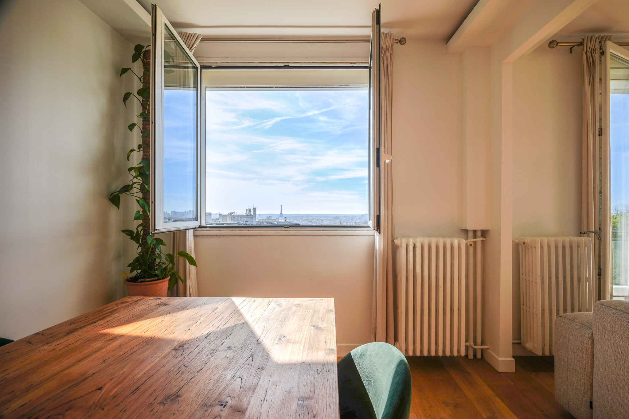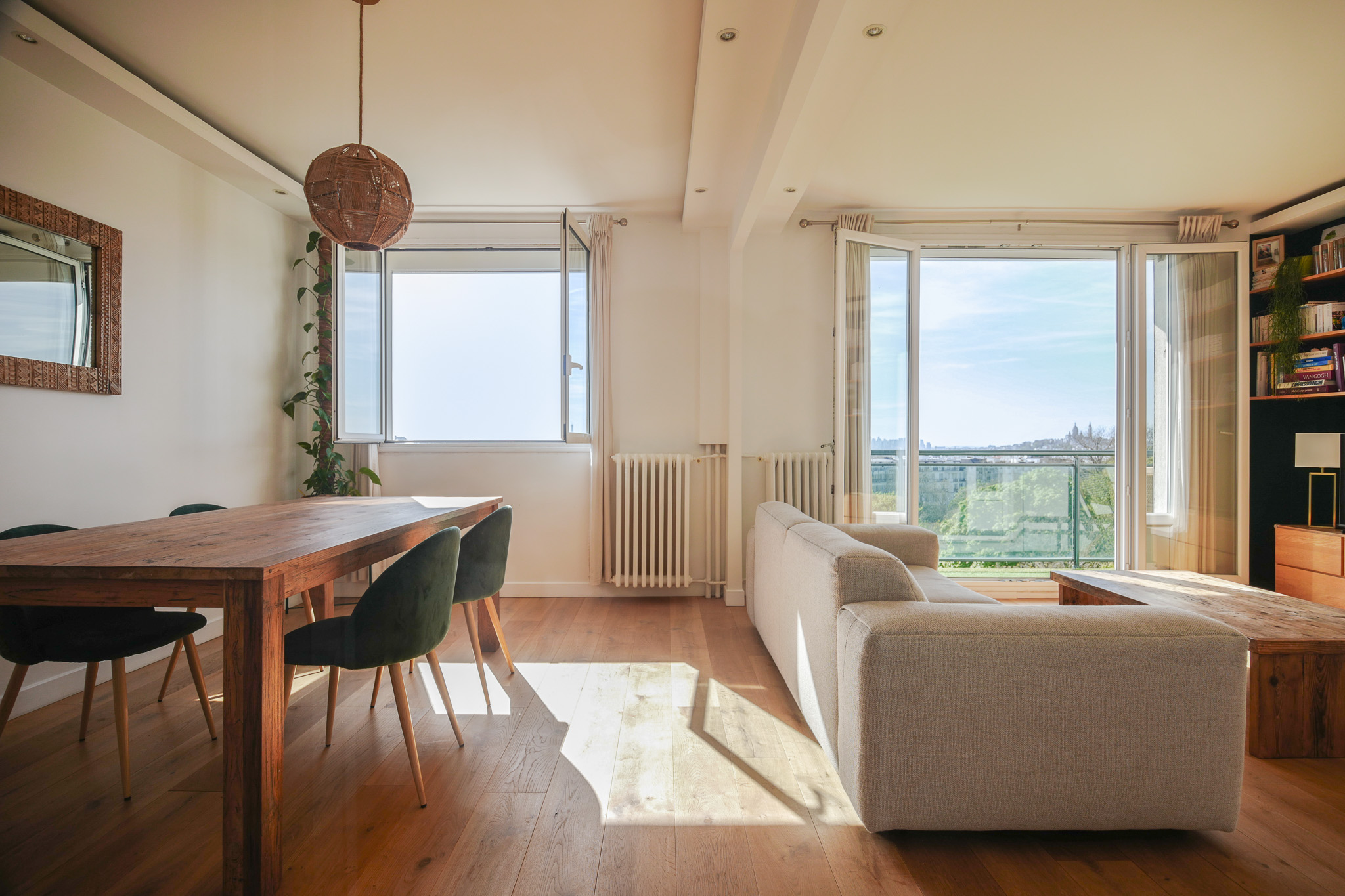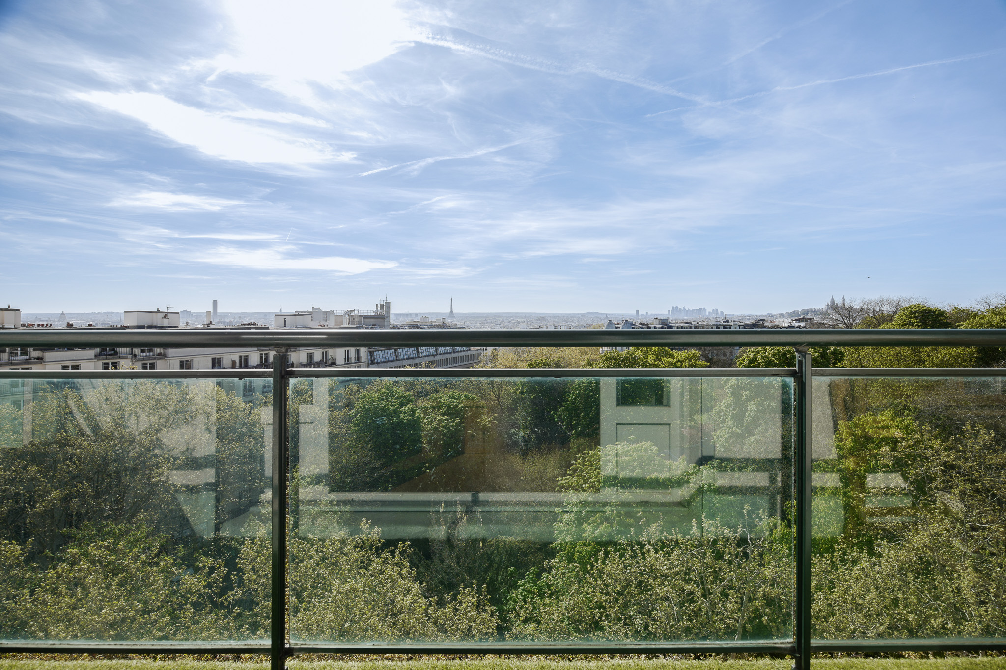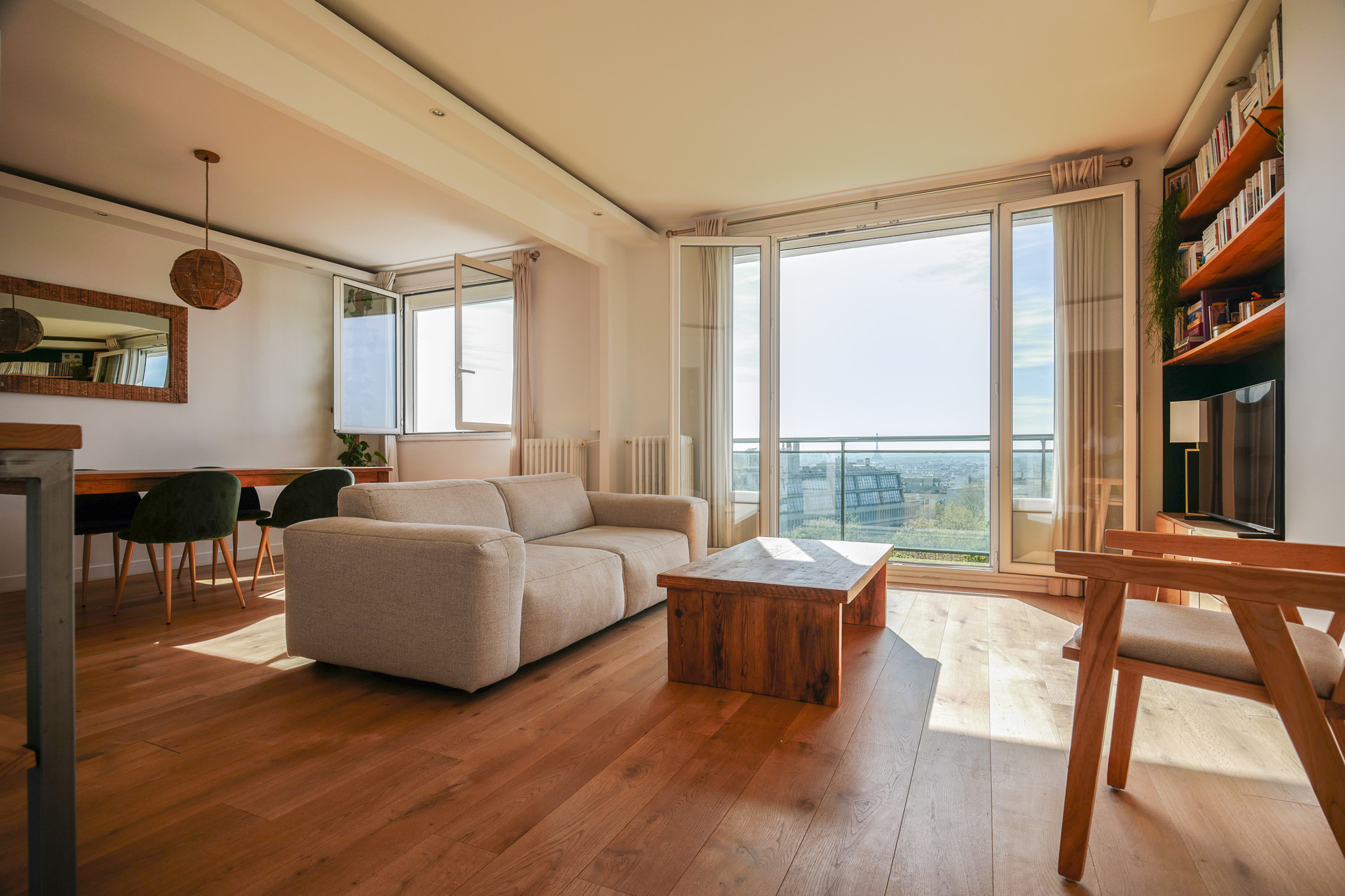 APPARTEMENT AVEC VUE DÉGAGÉE SUR PARIS ET SUR LE PARC ENTRÉE ESPACE BUREAU PIÈCE de vie AVEC BALCON cuisine indépendante 2 chambreS SUR COUR 1 salle de BAINS toilettes invités CAVE